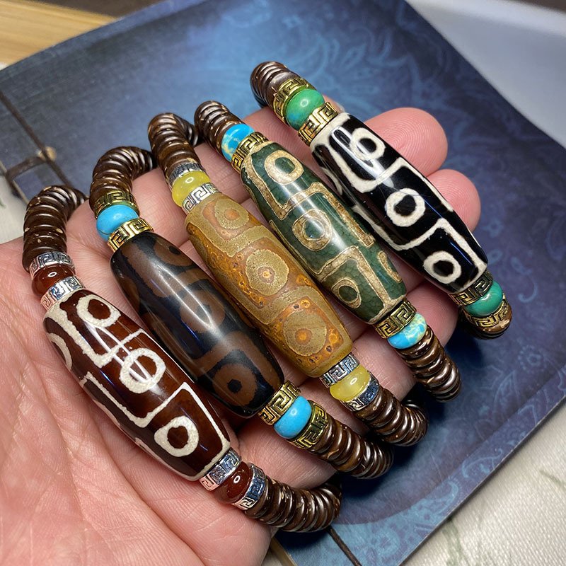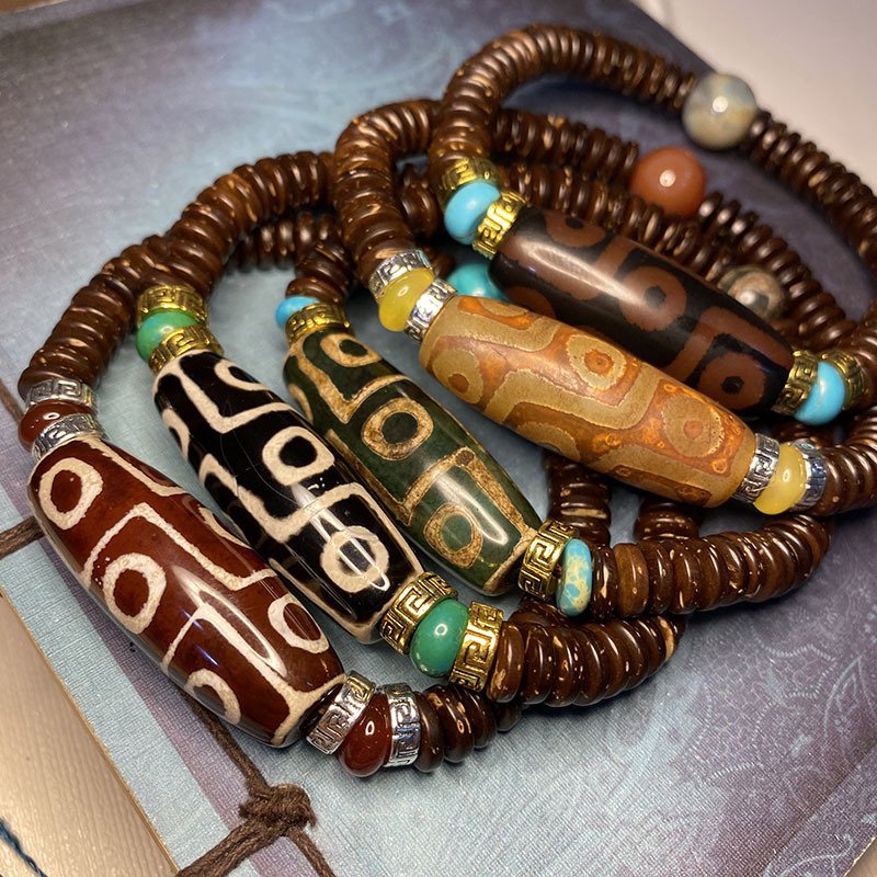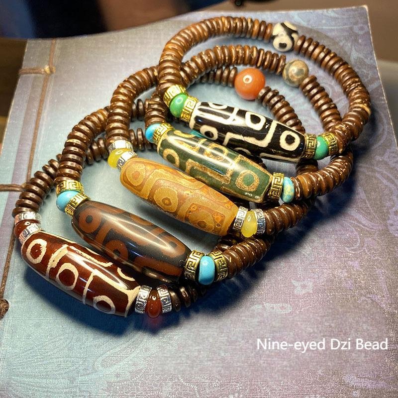 Original Tibetan Nine-Eyed Dzi Bead Bracelet, Raw Stone Polished Dzi Bead and Coconut Shell Bracelet, Unisex Heavenly-Eyed Prayer Bead Bracelet